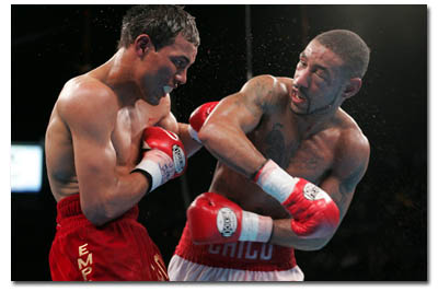 There was less return fire this time around, as Castillo jumped on the champion in the first round and never eased off his assault in the non-title encounter. Corrales committed the time-honored error of hooking with a hooker and as a result ended up looking at the ring lights courtesy of a laser-like left hook to the jaw. Corrales hit the deck face first before managing to stagger to his feet just as referee Joe Cortez counted him out at 47-seconds of the abbreviated fourth round.